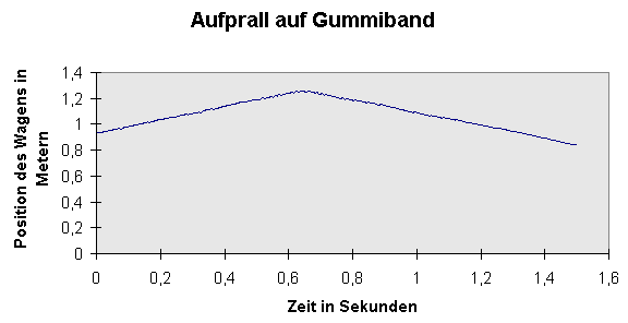 Das von uns entwickelte Computerprogramm beschränkt sich bewußt darauf, nur die Rohdaten zu kalibrieren und zu speichern. So kann es auch auf alten Rechnern (bis zum 286 hinab) problemlos eingesetzt werden. Dies ist ein wichtiger Aspekt, weil so die in Schulen nicht mehr benötigten alten Rechner doch noch weiter verwendet werden können. Zum anderen kann so die Auswertung auch durch die Schüler, auch plattformübergreifend, zu Hause (z.B. mit Microsoft® Excel) vorgenommen werden. Das Programm schreibt die Meßwerte in eine einfache Textdatei. Nachdem diese Datei in Excel eingelesen wurde, läßt sich eine Übersichtsgrafik erstellen. Im folgenden Beispiel wurde der bereits oben erwähnte Aufprall auf ein Gummiband aufgezeichnet (Abbildung 4).
