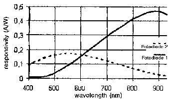 Genau genommen besteht der Sensor aus zwei Fotodioden, welche übereinander liegen. Jede reagiert jeweils unterschiedlich auf die gleiche Wellenlänge. Die beiden Fotodioden liefern also verschiedene Signale, die jeweils eine Funktion in Abhängigkeit von der Wellenlänge bilden. Für jede Wellenlänge läßt sich aus diesen zwei Kurven ein eindeutiger Quotient bilden. Der Meßbereich des Sensors reicht von 450nm bis 950nm.